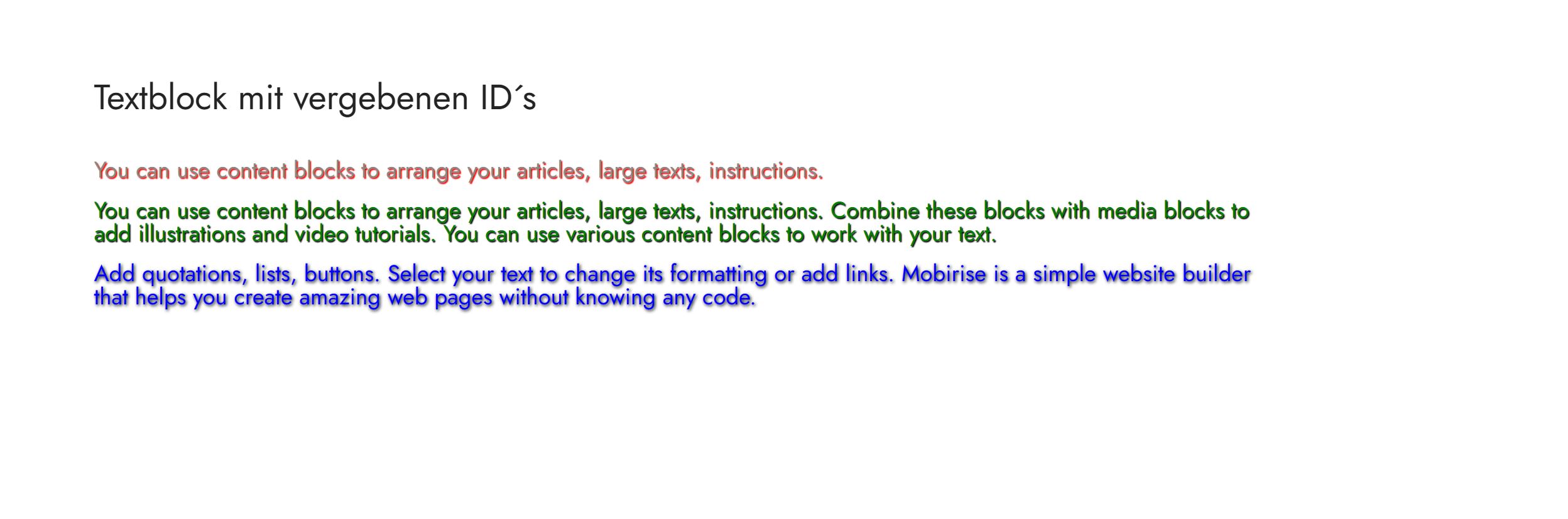 You can use content blocks to arrange your articles, large texts, instructions. Combine these blocks with media blocks to add illustrations and video tutorials. You can use various content blocks to work with your text.</p> <div id="meineID3" class="meinTextstyle"><p>Add quotations, lists, buttons. Select your text to change its formatting or add links. Mobirise is a simple website builder that helps you create amazing web pages without knowing any code.</p></div>