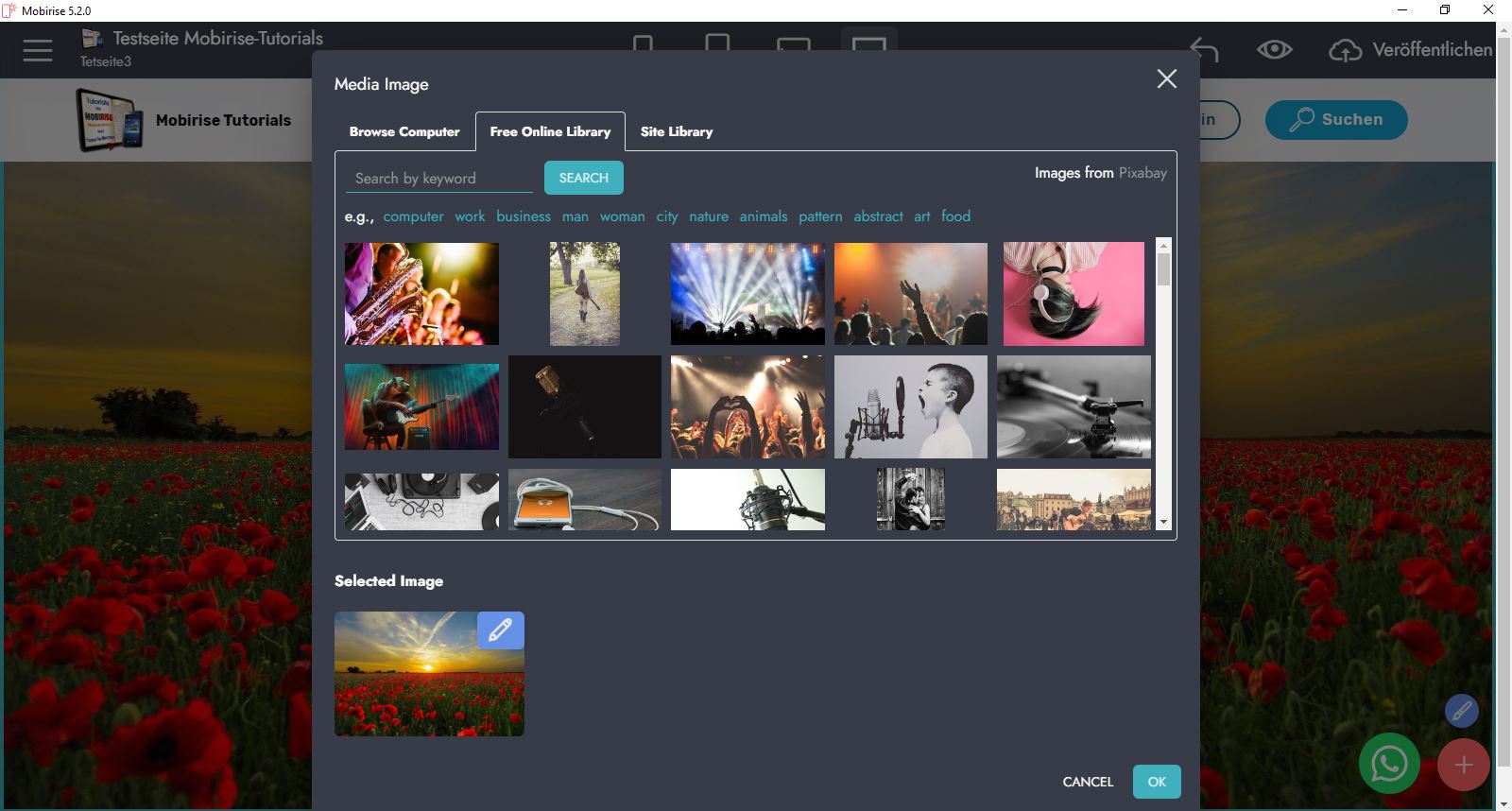 dann kannst Du im Bild-Editor Bilder aus dem Mobirise-Archiv von "Pixabay" wählen oder am Reiter "Browse Computer" Deine eigenen vom PC: