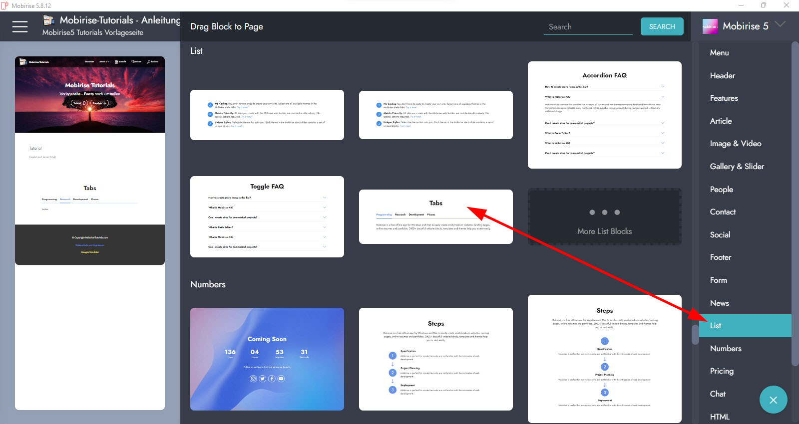 Ich verwende die Grundthemen von Mobirise 5, und einige horizontale M4/M5 Listen-Blöcke.