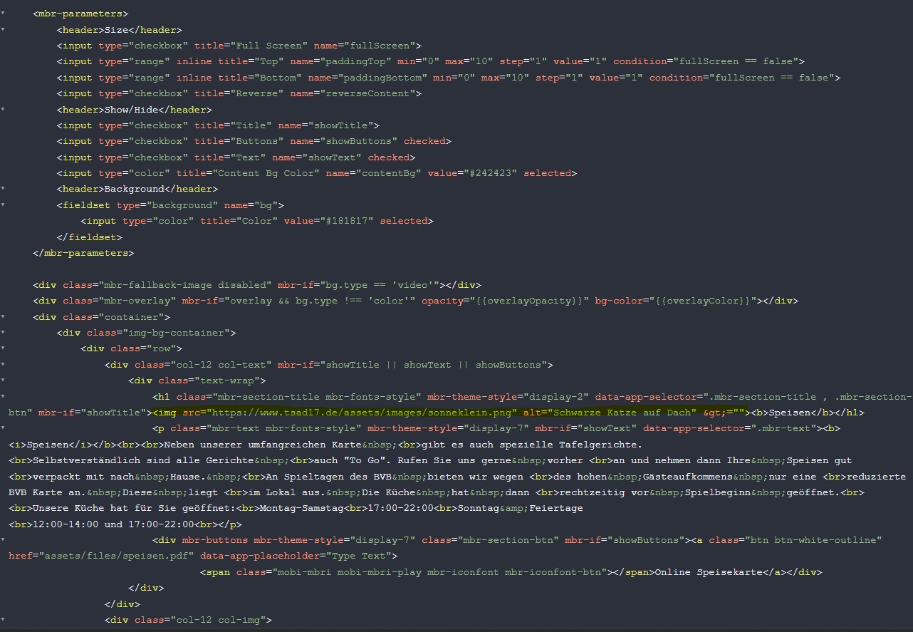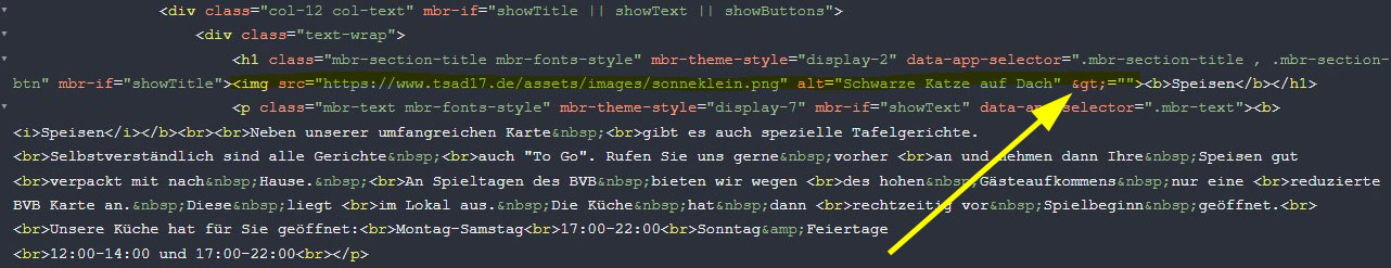 <h1 class="mbr-section-title mbr-fonts-style" mbr-theme-style="display-2" data-app-selector=".mbr-section-title , .mbr-section-btn" mbr-if="showTitle">img src="https://www.tsad17.de/assets/images/sonneklein.png" alt="Schwarze Katze auf Dach"><b>Speisen</b></h1><p class="mbr-text mbr-fonts-style" mbr-theme-style="display-7" mbr-if="showText" data-app-selector=".mbr-text"><b>