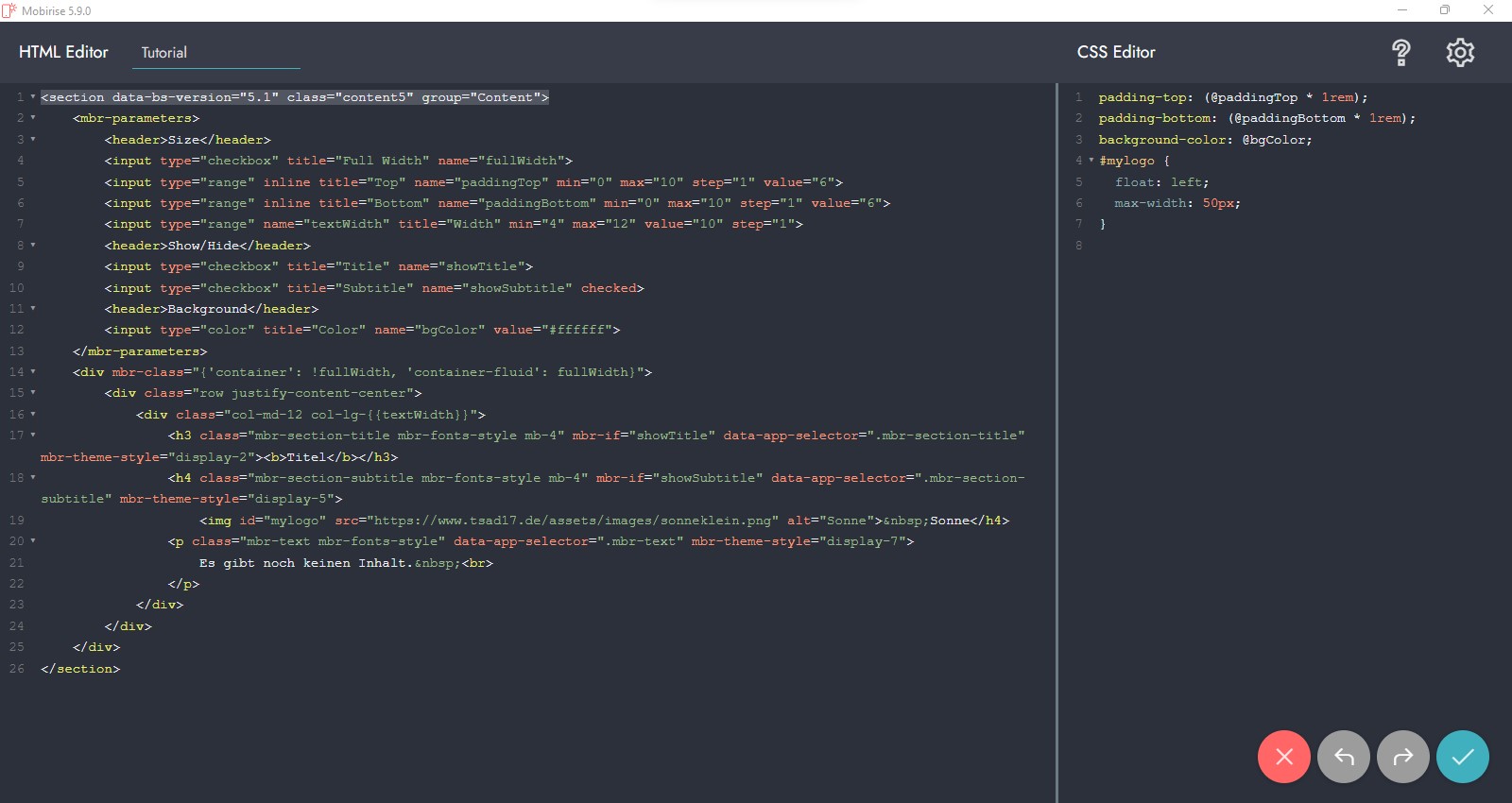 Die CSS gehört dann in den Bereich "CSS Editor" (rechte Bereich vom "Code Editor"). Da das <img> Tag einen Umbruch erzeugt habe ich da ein: