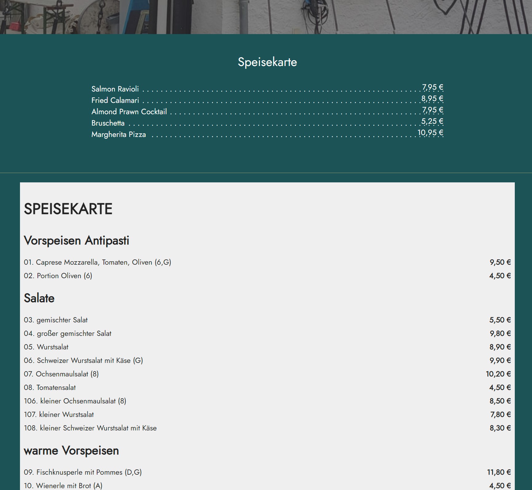 Allerdings sitzen die Punkte vertikal genau zwischen den Gerichten und nicht mittig und sie schieben sich am Handy auch in die Texte. Ich finde auch die Definition der class="preise" gar nicht auf Deiner Seite und die Preise sind nicht rechtsbündig. Hast Du die vielleicht vergessen?