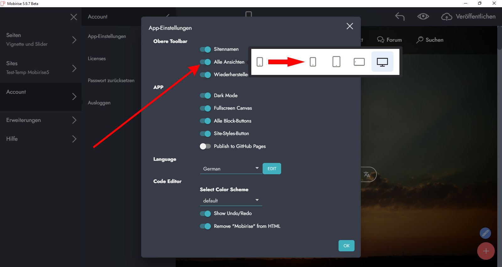Eventuell gibt es noch eine andere Stelle wo man mehr Auswahlmöglichkeiten hat? Das Symbol was ich meine ist ganz Oben mittig am Monitor zu sehen, direkt oberhalb des Designfeldes, in der waagerechten Menüleiste von Mobirise.