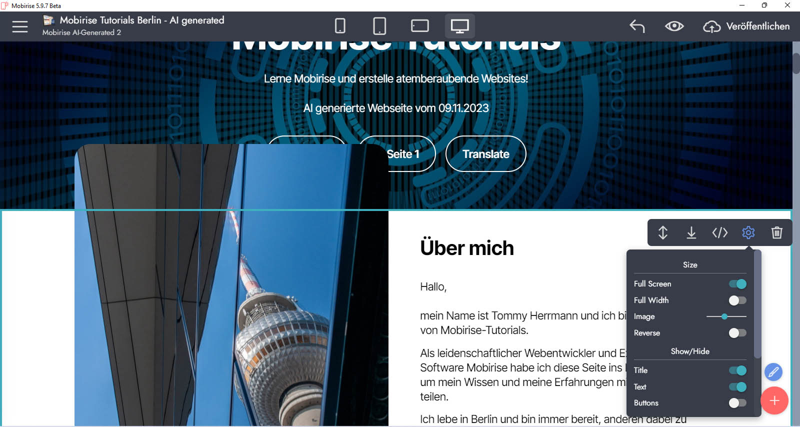 Das ist meine gestern von "Mobirise AI" (künstlicher Intelligenz) neu generierte Webseite (Thema "StartM5"):