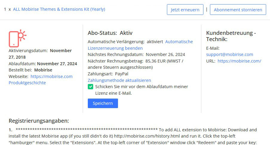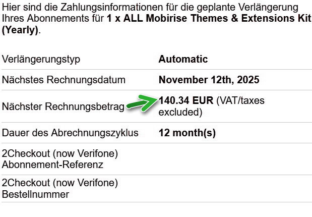 Man muss sich direkt an den 2checkout-Support werden, die wickeln ja die Zahlungen ab. Ich habe immer den mobirise-Support in cc gesetzt. Nach vielem Hin & Her wurde ich aufgeklärt, dass Rückzahlungen zur Vermeidung von Betrügereien erst nach 6 Wochen vorgenommen werden. Wenn ich es hoffentlich richtig verstanden habe, die Korrespondenz war in englisch, sollte ich den Gesamtbetrag selbst stornieren. Das habe ich jetzt auch getan. Da es sich aber um die ganze Summe handelt hat, hoffe ich nicht, dass die Pro-Version von Mobirise jetzt gesperrt wird, da ich es für meine Arbeit benötige. Immer wieder spannend.