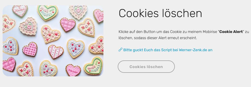 ... und man kann am Button "Cookies löschen" diesen Cookie, der für das Ausschalten von diesem Hinweis von Mobirise gesetzt wird, wieder löschen um es erneut zu testen: