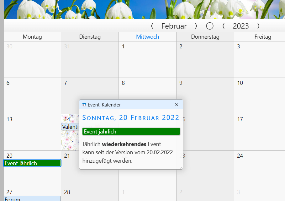 Der Fehler zeigt sich auch bei Tommy's Tutorial-Kalender beim Eintrag am 20. Februar 2022. Öffnet man diesen Eintrag am 20. Februar 2023, wird der falsche Wochentag und noch immer mit dem Jahr 2022 angezeigt.