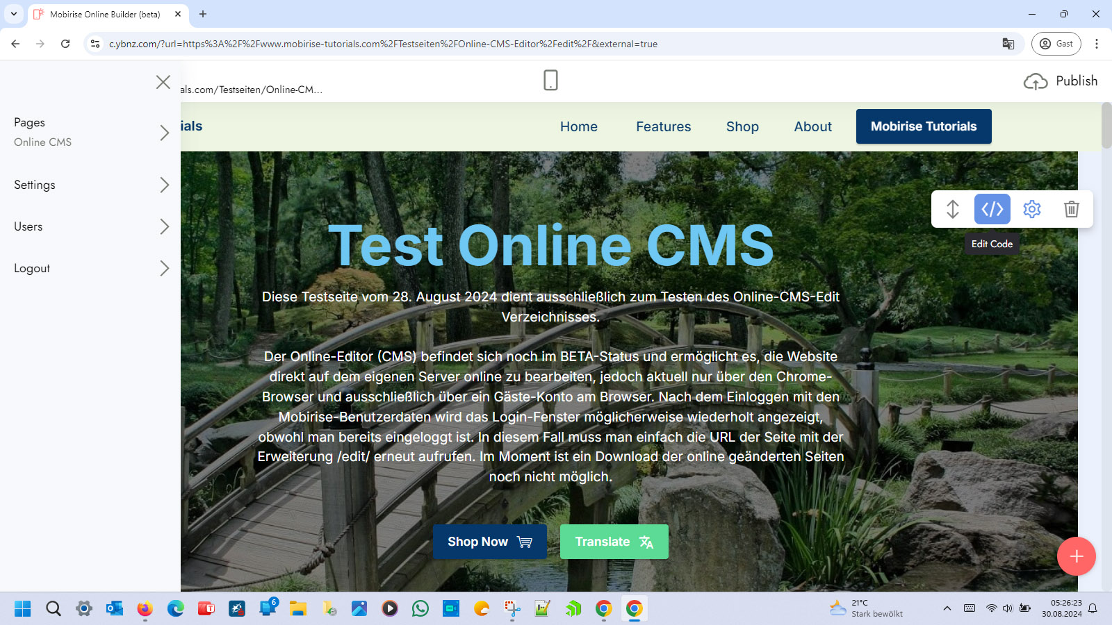 Ich habe gestern nochmals einen Test mit der Mobirise v5.9.21 BETA mit dem Online-Editor vorgenommen: