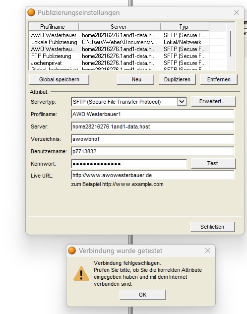 ... also, ich kann nach wie vor auf meinen "IONOS" Server mittels NOF publizieren. Bist Du sicher, dass das Passwort korrekt ist und auch der Port: 22 (am Button "Erweitert") verwendet wird?