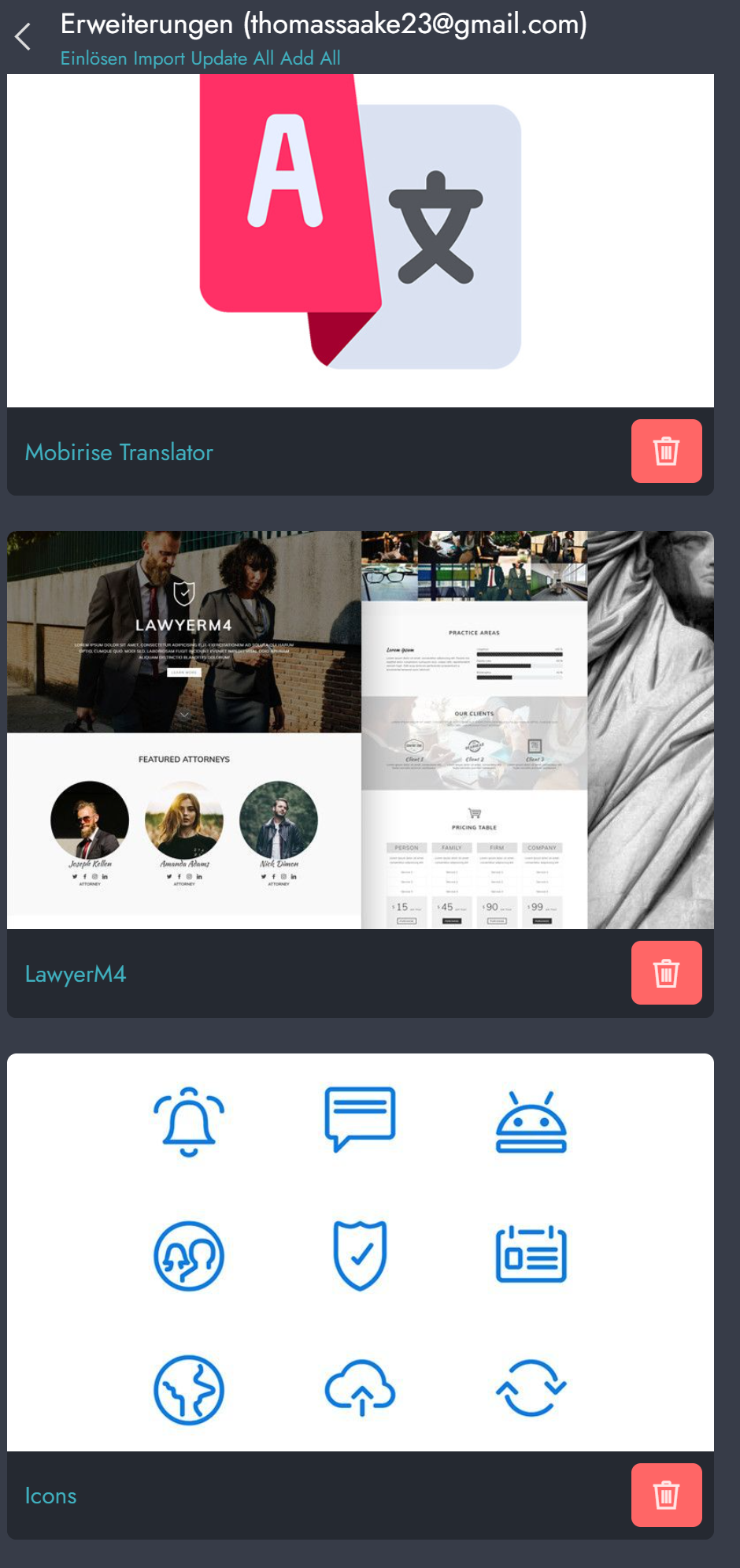 1) klicke auf den roten Papierkorb an der Kachel "Icons" und deinstalliere dieses Erweiterung damit