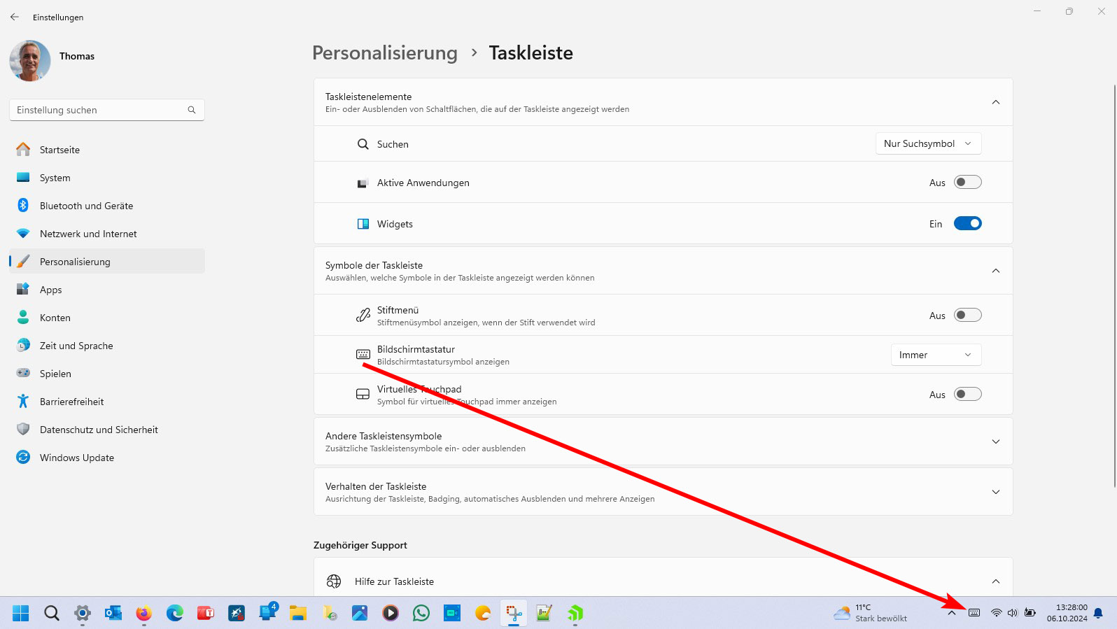 Du kannst die gleichen Smileys und Icons von Windows über die Bildschirmtastatur in Windows 10 und 11 verwenden. Es empfiehlt sich, diese Tastatur dauerhaft in der Taskleiste zu verankern, wie hier beschrieben: