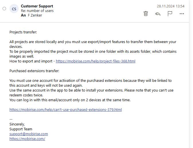 Derzeit habe ich die All Mobirise Themes&Extensions Lizenz auf meinem privaten Rechner, um mit meinem privaten Account Mobirise zu testen und unsere betagte NOF-Site ins 21. Jahrhundert zu "transformieren". Perspektivisch soll das Projekt dann über meinen Verein gepflegt und finanziert werden. Ist es korrekt, dass ich das Projekt später nur an meinem Rechner zu exportieren und auf dem Rechner eines weiteren Users wieder zu importieren brauche, natürlich mit dann eigenem Vereins Account und Lizenz? So können dann 2 User am selben Projekt arbeiten. Man muss dann nur die Projektdateien dann jeweils dem anderen (per FTP) zur Verfügung stellen, damit jeder immer den aktuellen Stand hat. Und dann genügt auch eine Vereins-Lizenz für die beiden Rechner/User.