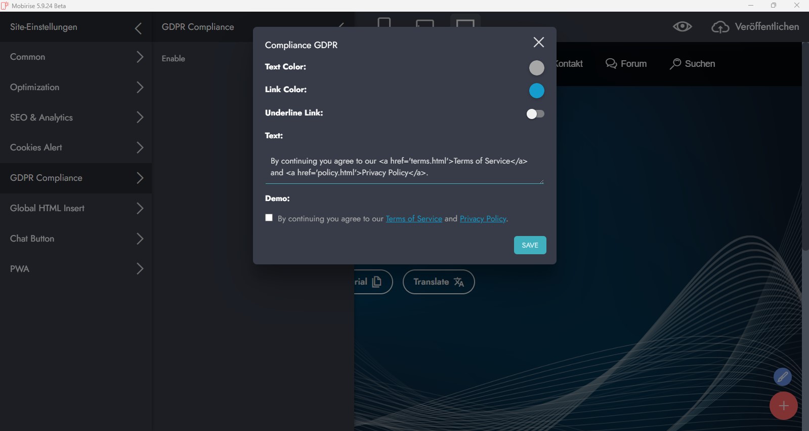 Ja, der "GDPR" (DSGVO) Hinweis ist erst viel später mit einem Update in die Software gekommen und daher kann man den nur an dieser Stelle bearbeiten. Auch einen Link kann und muss man nur dort direkt, mit dem entsprechenden HTML-Code, einbauen. Das geht dort ausnahmsweise nicht über die üblichen Mobirise-Werkzeuge.