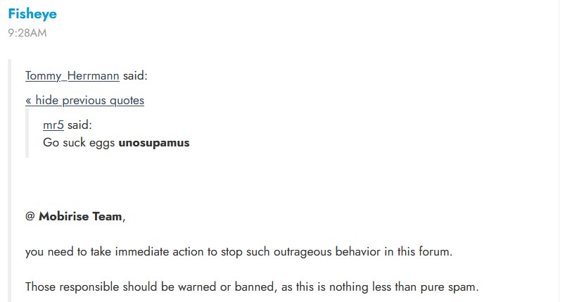 Das ist einfach unter jeder möglichen Akzeptanz und daher habe ich User "Unosupamus" gegen diese Aggression versucht zu unterstützen und mich massiv bei der Geschäftsleitung von Mobirise gegen so einen unterirdischen Ton beschwert. Das schadet nicht nur dem Forum enorm, sonder auch Mobirise und jedem beteiligten Benutzer. Offensichtlich war Mobirise auch meiner Meinung und hat das Board deswegen geschlossen und die beleidigenden Beiträge alle gelöscht.