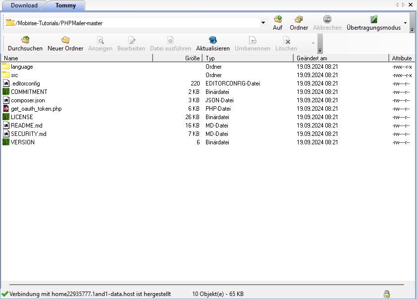 So sieht das Verzeichnis vom "PHPMailer" dann am Server aus, das im Stammverzeichnis des verwendeten Projektes liegen muss. Solltest Du jetzt ein Verzeichnis "test" angelegt haben, dann gehört das auch in dieses Verzeichnis "test". Also immer in das Root (Wurzel) Verzeichnis des jeweiligen Mobirise-Projektes.