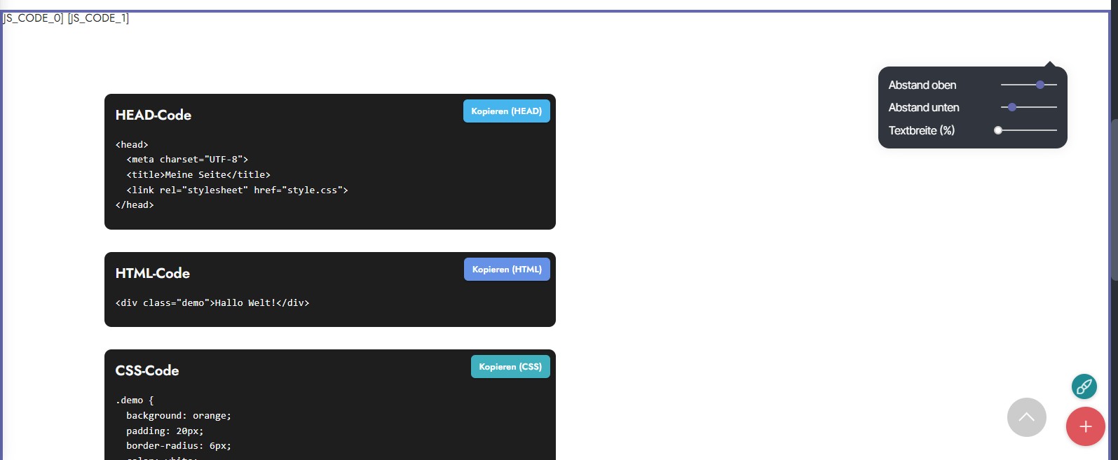 Das bewirkt, dass diese Code-Container nun immer linksbündig stehen und an einer von mir gar nicht gewollten Stelle beginnen, denn meine Blöcke auf der Seite sitzen viel weiter mittig. Der alte Regler für die Breite würde in diesem Fall also weiter benötigt, damit alles formatierbar bleibt. In meinem Fall, könnte ich diese Platzierung so nicht auf meinen Tutorialseiten gebrauchen.