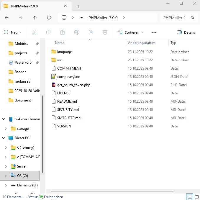 Entpacke das ZIP-Archiv mittels Doppelklick und kopiere den Inhalt vom Verzeichnis "PHPMailer-7.0.0", also alle Verzeichnisse und Dateien wie im Screenshot zu sehen ...