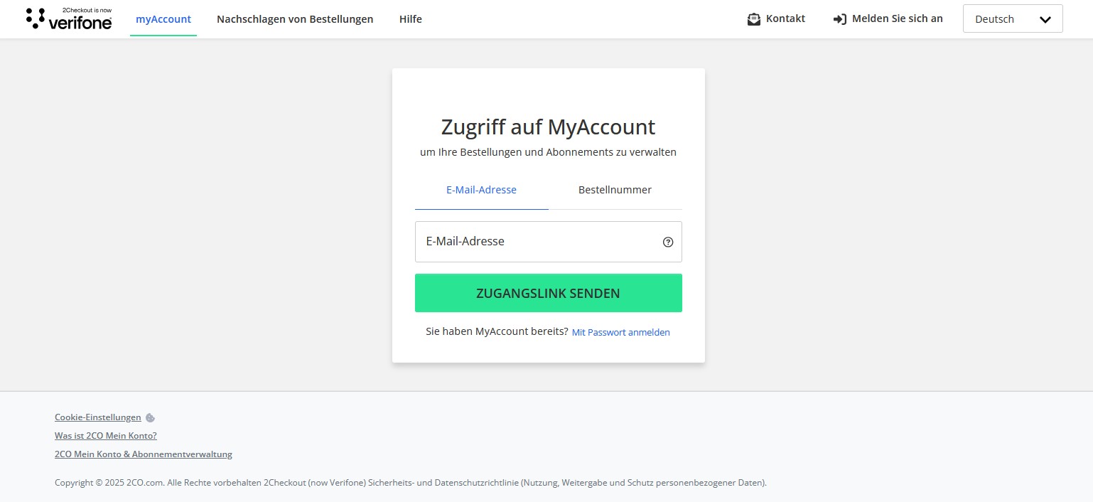 Logge Dich in Deinem Konto bei "2Checkout" im Fenster "Zugriff auf MyAccount" mit den gleichen Zugangsdaten wie bei Mobirise unten am Link "Mit Passwort anmelden" ein. Wähle zuvor rechts oben Deine Sprache "Deutsch":