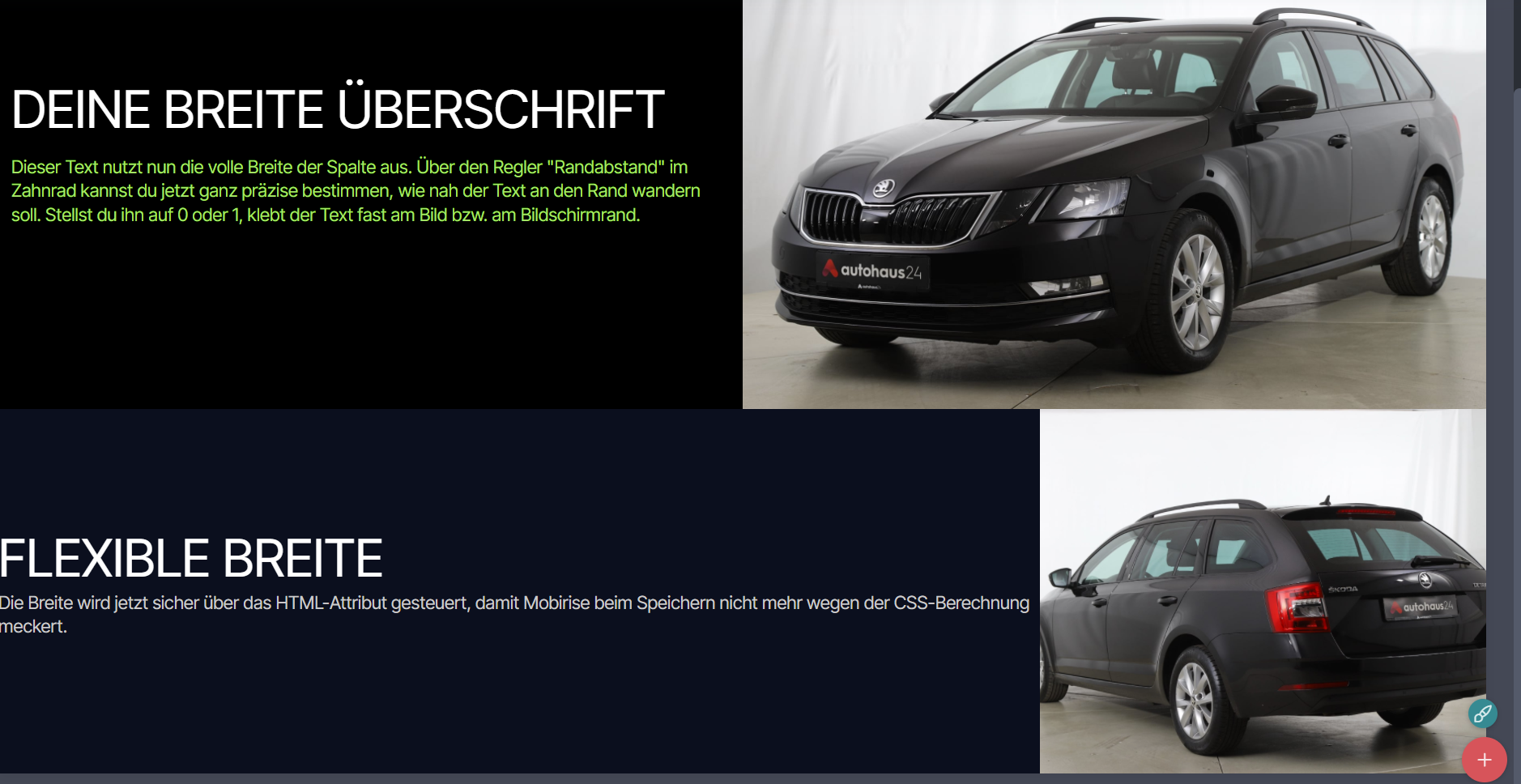 Einen Block mit einem Bild wahlweise rechts oder links. Andere Seite Text mit Überschrift. Alles responsive. Der Block komplett isoliert - keine Beeinflussung von anderen Blöcken und keine anderen Blöcke beeinflussen. Beide Seiten gleich groß, der Hintergrund mit unterschiedlichen Farben. Keinen Abstand zwischen Text und Bildbereich. Das ganze kompatibel mit Mobirise 4.12.x :)