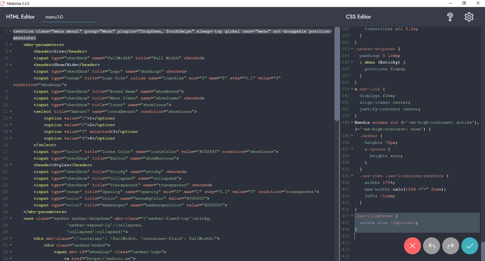 In Mobirise wird für Links eine "Bootstrap-Class", wie z.B. class="text-primary", verwendet (je nachdem, welche Farbe Du für den Link bei den globalen (Pinsel) Einstellungen ausgewählt hast). Das sieht dann z.B. so aus: