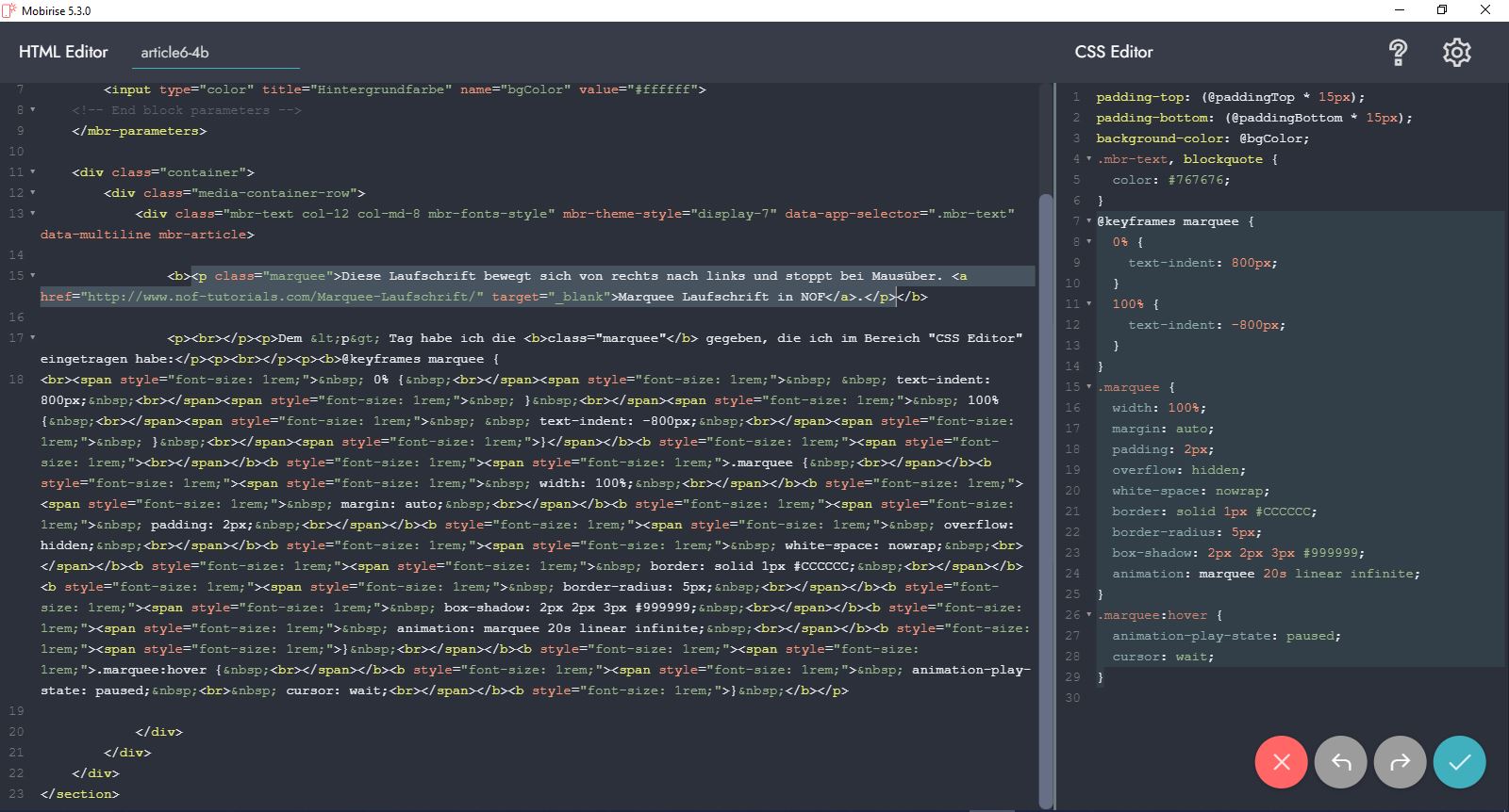 Dabei kommt dann die CSS rechts in den Bereich "CSS Editor" und die class="marquee" habe ich dann an ein <p> Tag mit dem Text geschrieben, wie Du links im Bereich "HTML Editor" vom "Code Editor" erkennen kannst (beides habe ich markiert):