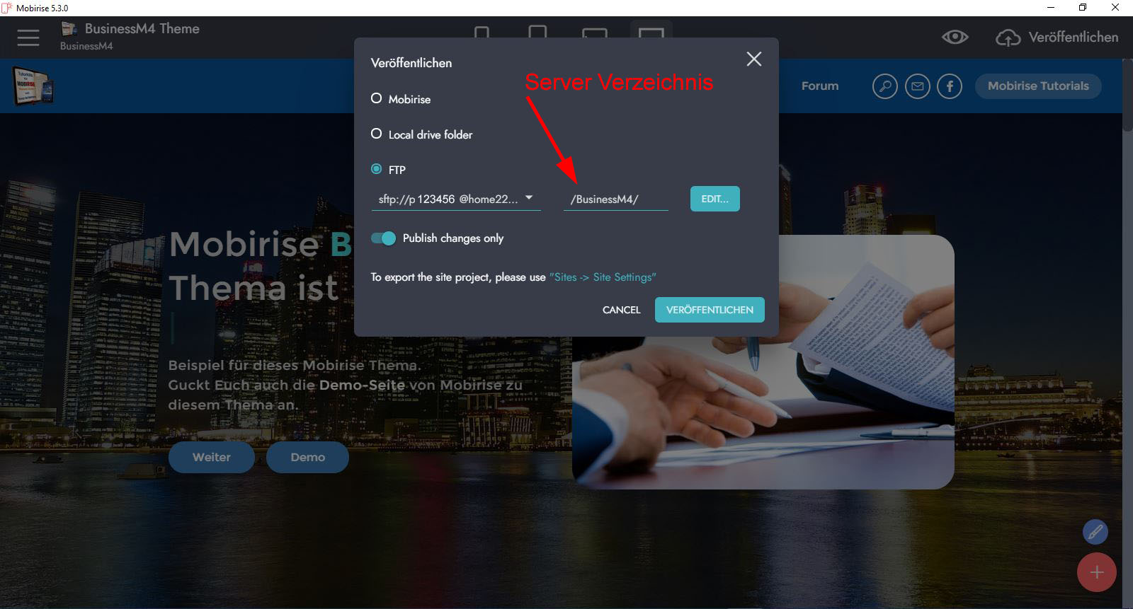 Leider kann man aber immer nur ein Verzeichnis pro Server, im Feld rechts neben der Server-Adresse, eintragen, das man bei Bedarf dann immer wieder anpassen muss. Das habe ich seit Jahren, gefühlte Hundert Mal gemeldet, es scheint aber bei Mobirise niemanden zu interessieren.