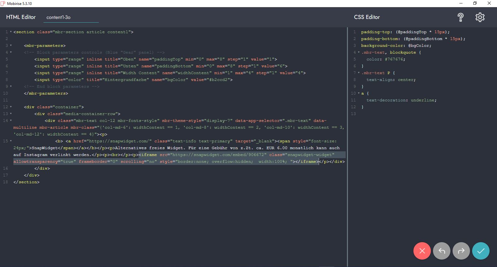 Was hast Du denn für einen Mobirise-Block aus welchem Mobirise-Thema verwendet? Zeige auch mal einen Screenshot von Deinem Einbau.