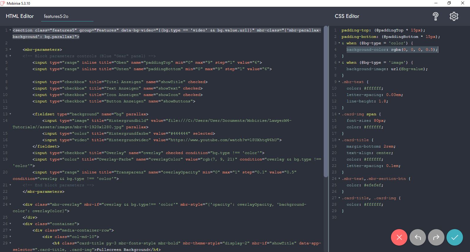 Du änderst also für einen transparenten Hintergrund meist im Mobirise-Block im Bereich "CSS Editor":