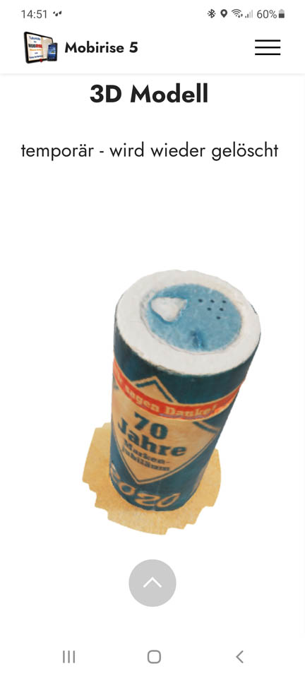 Ich möchte die HTML-Seite nicht in Mobirise einbauen, sondern möchte mit Mobirise eine Seite erstellen, worin die GLB-Datei angezeigt wird. Da ich es so dann nie hinbekommen habe, dass es bildschirmfüllend angezeigt wird, habe ich einfach mal eine separate HTML-Seite erstellt und geschaut wie das dann mit dem Skript aussieht. Das sieht dann gut aus, s. verlinkte Seite ohne meine mit Mobirise erstellte Website drumherum.