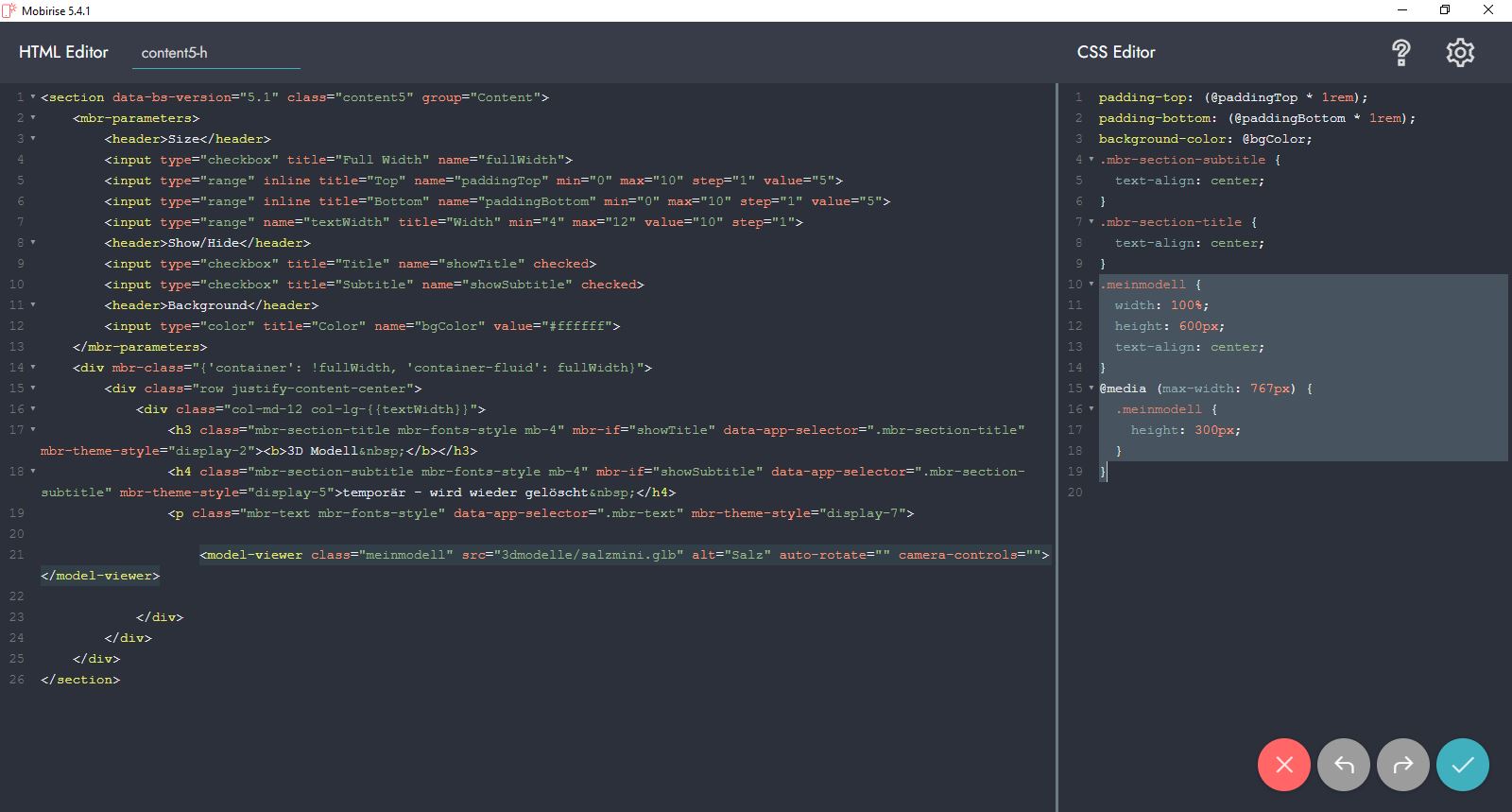Die Frage bzw. Aufgabenstellung ist jetzt einfach nur, wie bekomme ich die paar Textzeilen aus der 3dmodels.html (Seite ohne Mobirise erstellt) in die 3dmodelle.html (mit Mobirise erstellt) so dass das 3D-Modell immer noch schön groß angezeigt wird.