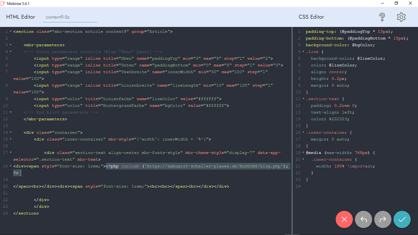 Du musst auch auf jeden Fall den "Code Editor" von Mobirise gekauft und installiert haben. Solltest Du da irgendwelche Drittanbieter - Erweiterungen installiert haben, dann passieren solche Dinge. Ich warne schon seit Jahren davor. Ohne den Mobirise "Code Editor" kannst Du keinen PHP-Code anwenden. Mobirise weiß sich inzwischen gegen die Sabotage ihres Business zu wehren.