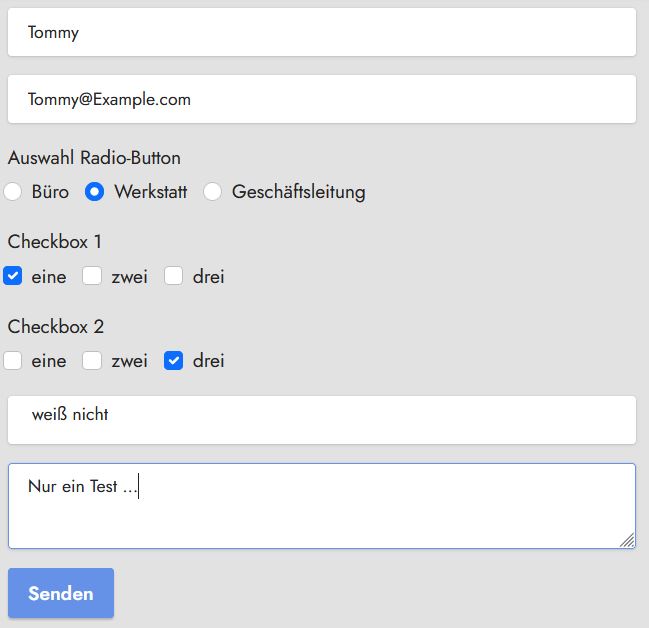 Hinweis: Die Gruppe muss denselben Namen (den Wert des Attributs "name") haben, um als Gruppe behandelt zu werden. Nachdem die Optionsfeldgruppe erstellt wurde, werden durch die Auswahl eines Optionsfelds in dieser Gruppe automatisch alle anderen ausgewählten Optionsfelder in derselben Gruppe deaktiviert. Man kann beliebig viele Radiogruppen auf einer Seite haben, solange jede Gruppe einen eigenen Namen hat.