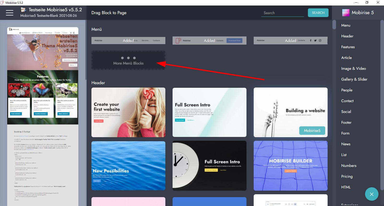 theoretisch sollte man das können, indem man auf diese schwarze Kachel "More Menü Blocks" klickt. Leider passiert dann aber bei den "Menüleisten" gar nichts.