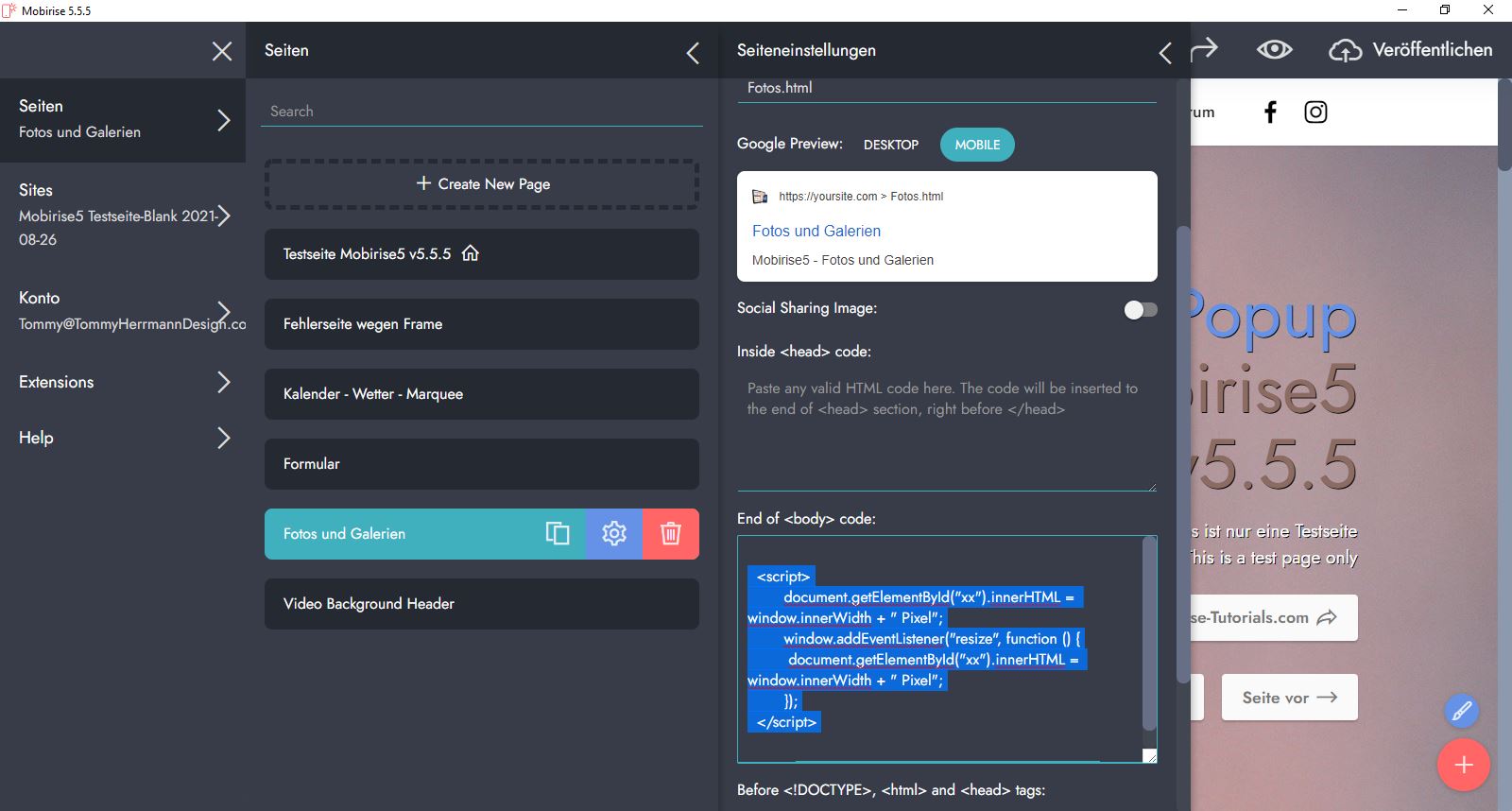 Dafür habe ich dieses JavaScript in den Seiteneinstellungen in den Bereich "End of <body> code:" eingebaut: