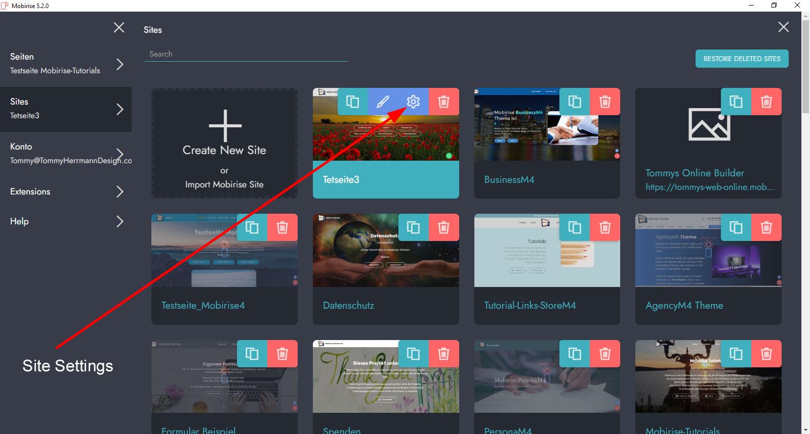 Diese Erweiterung könnt Ihr unter den "Site Settings" aktivieren/deaktivieren und einrichten. Klickt dazu auf "Sites" und am gewünschten Projekt auf das Symbol "Zahrad":
