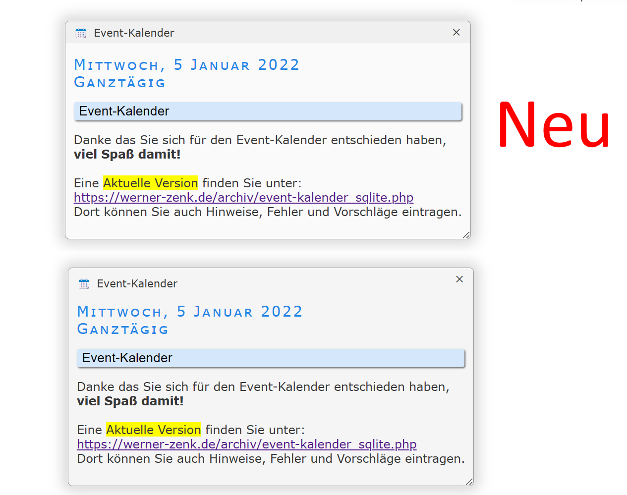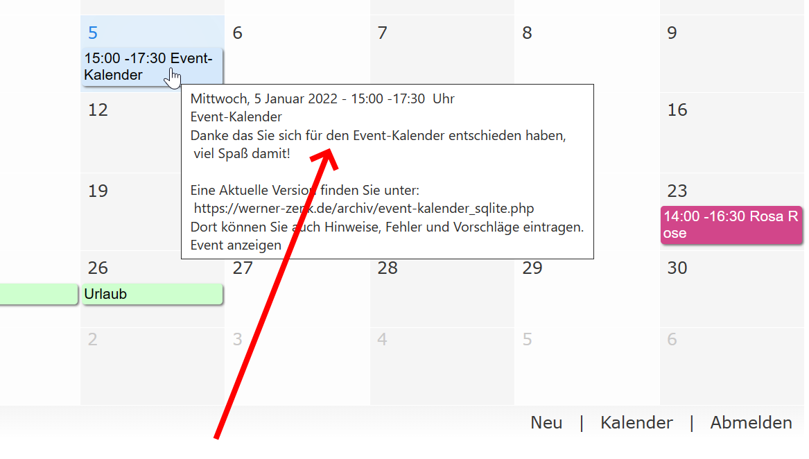 Im großen Event-Kalender hatten sich viele gewünscht (und ich auch) dass bereits Infos angezeigt werden, wenn man mit dem Mauszeiger auf dem Event zeigt: