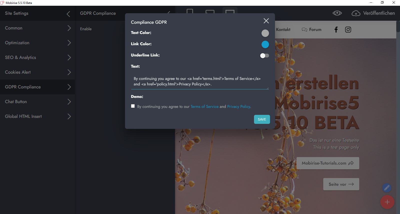 Du hast im Menü von Mobirise den Datenschutz-Hinweis aktiviert, dadurch wird unter jedem Formular diese kleine Checkbox mit diesem Beispieltext angezeigt. Das Formular kann dann nicht ohne ein Häkchen (Einverständns) zu setzen gesendet werden.
