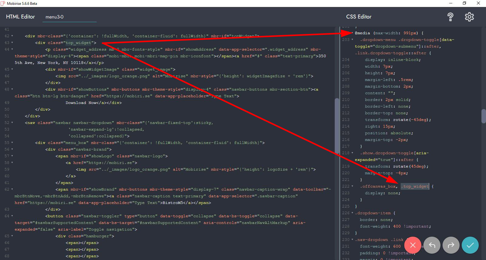 ... wundere Dich nicht, dass nach dem Speichern diese Anweisung an anderer Stelle vom Generator platziert wird, da es diesen Breakpoint bereits gibt wird das vom Mobirise-Generator dorthin verschoben. Du kannst das aber zunächst auch ganz unten im "CSS Editor" einfügen. Den Rest erledigt Mobirise.