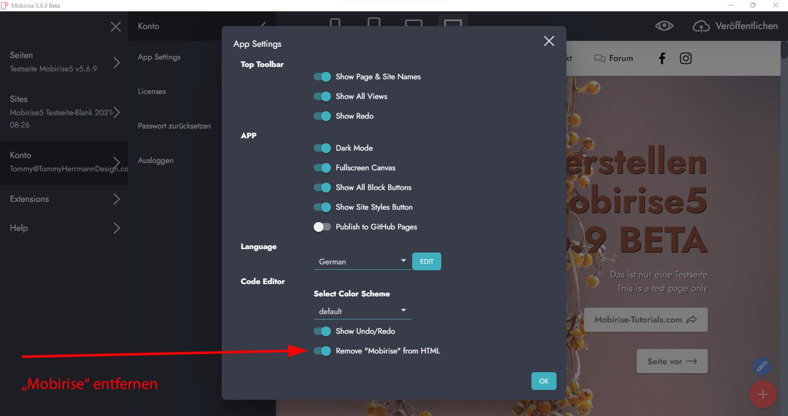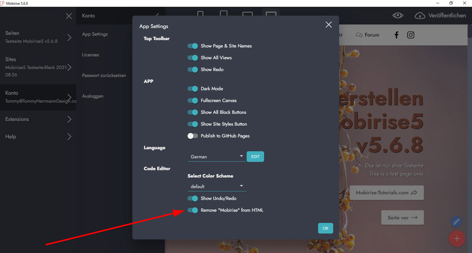 > Konto > App Settings > Schalter: Remove "Mobirise" from HTML