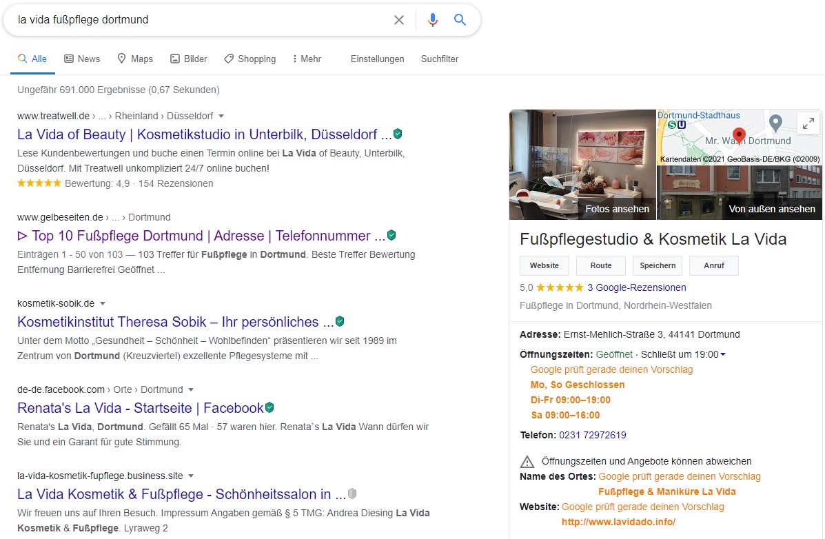 Wenn ich jetzt z.B. Fußpflege, Dortmund, Innenstadt bei Google eingebe und suche