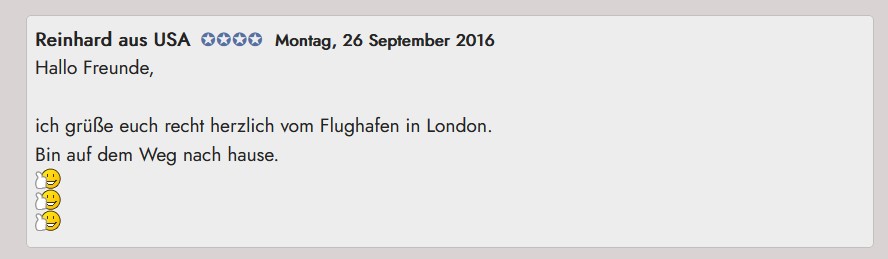 Ich bin gerade beim MySQL-Gästebuch, hier das bisherige (das neue kann ich noch nicht zeigen, da es in einem geschützten Verzeichnis liegt, dessen Passwort ich nicht hier schreiben kann). Die Schrift wurde nicht aus der CSS verwendet und in "Courier" ganz klein dargestellt, das Problem habe ich nach langem Suchen aber bereits beheben können.