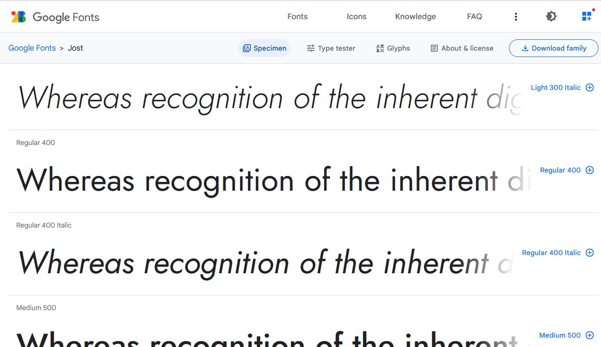 Das hier läd z.B. eine CSS runter die Jost mit normaler (Regular/400) und bold (700) enthält.