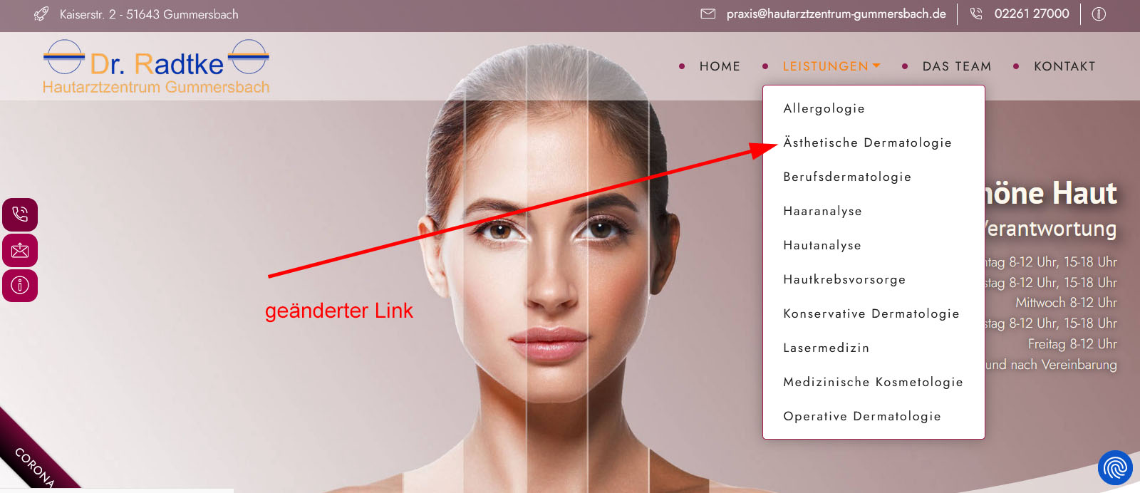Dann sieht das so, beim Klick auf das Untermenü "Ästhetische Dermatologie", aus: