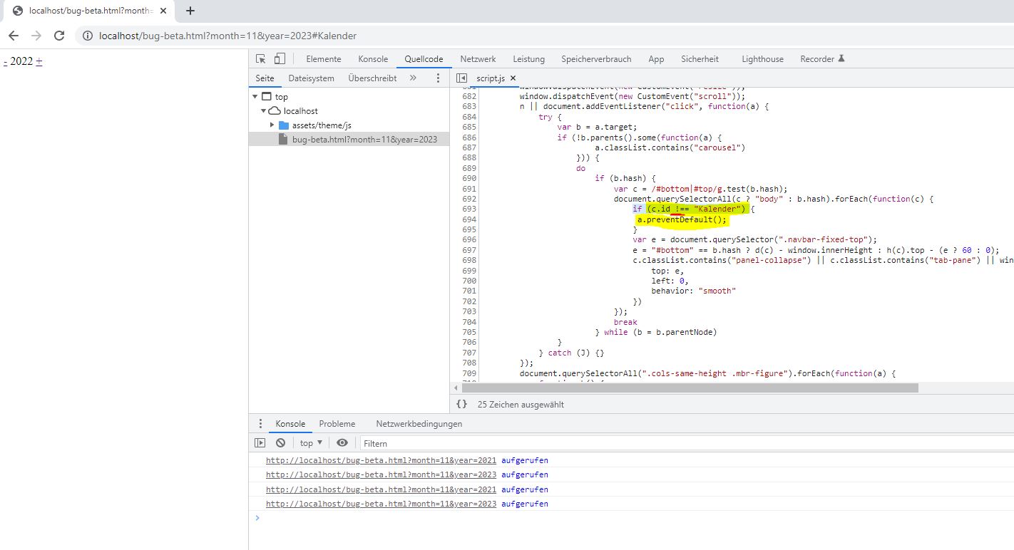 Jetzt hängt es noch an der script.js, wenn ich deren Event-Listener entferne klappt es wieder.