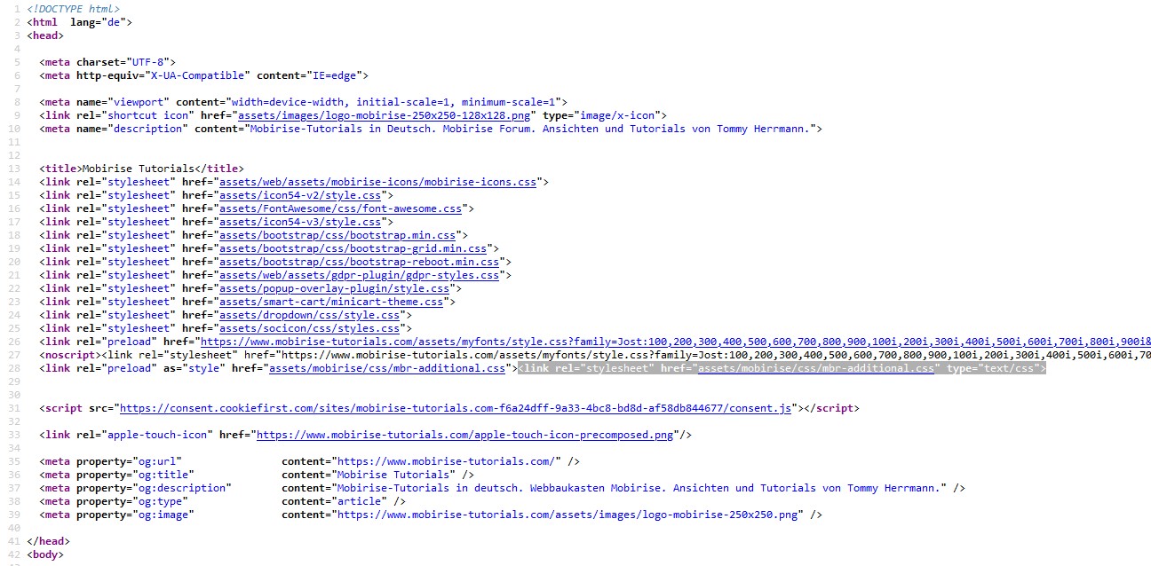 Zuvor siehst Du andere CSS-Dateien, die zum Thema von Mobirise gehören und auch die vom Framework "Bootstrap", die das Design-Gerüst der gesamten Anwendung ausmachen.