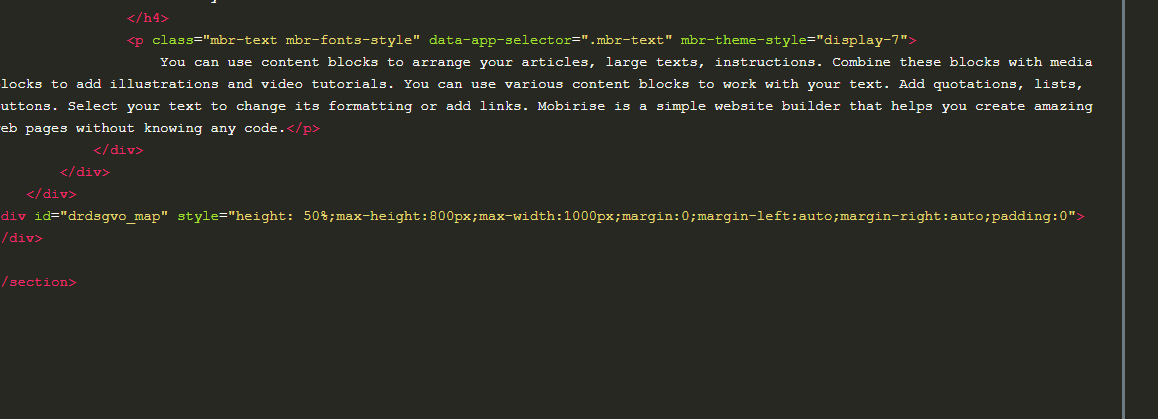 Man kann sich uneingeschränkt an die Anleitung halten und benötigt keinerlei Größenangaben für die Karte, denn die Größe wird ja vom verwendeten <div> von Mobirise bestimmt.