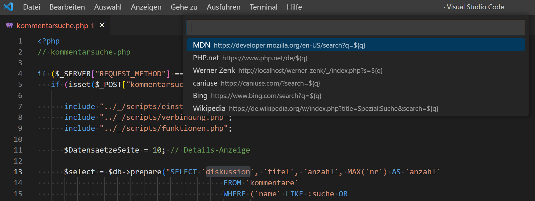 Der Editor: Visual-Studio Code bietet eine ähnliche Funktionalität mit der Erweiterung: net search an.