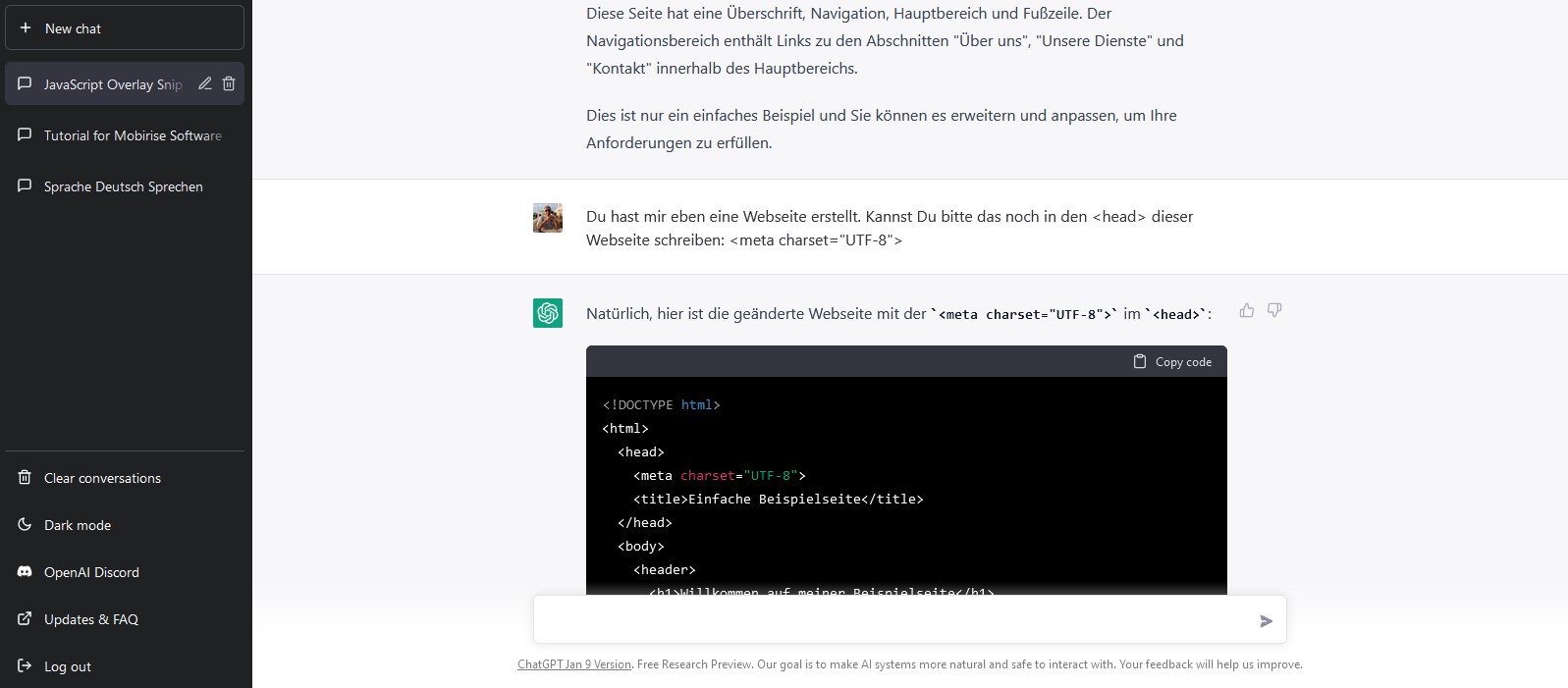 Noch ein Versuch, diesmal soll mir "OpenAI" (AI = Artificial Intelligence / KI = Künstliche Intelligenz) mit seinem "ChatGPT" eine ganze Webseite erstellen.