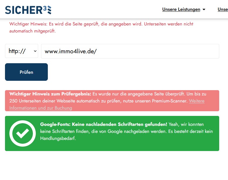 Bei diesem Checker muss man jede Seite einzeln prüfen lassen, bei der man Verdacht hat. Wenn man z.B. andere Google-Dienste wie "Google Maps" oder auch "YouTube" einbindet, wird wieder "Google Fonts" über diese APIs im Hintergrund nachgeladen. Da muss man aufpassen - aber solche Anwendungen hast Du ja nirgendwo.