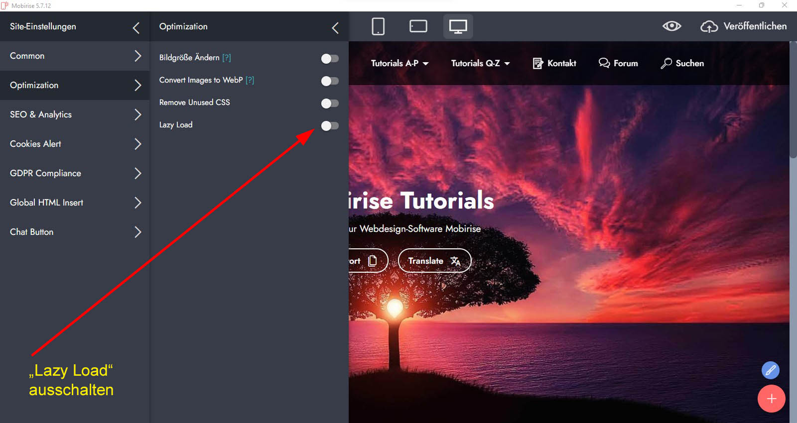 (Zahnrad an Projekt-Kachel) > Optimization > "Lazy Load" (Schalter ausschalten)